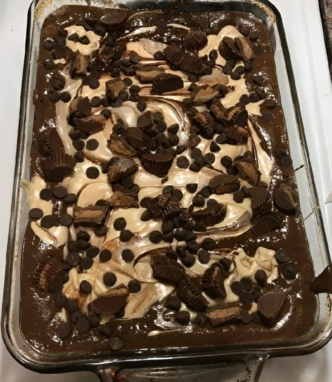 - Prepare the chocolate cake mix according to package directions and pour into the prepared baking dish.