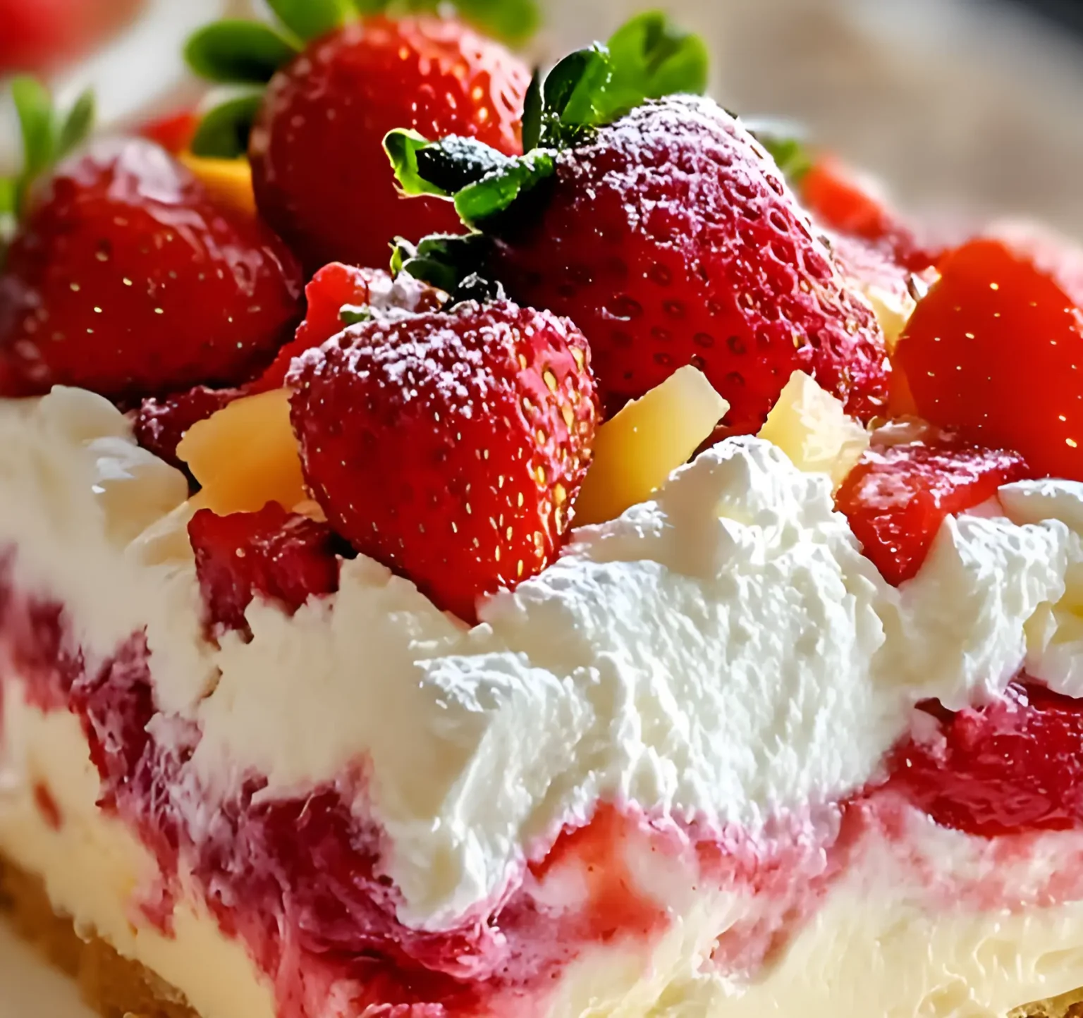 - Top It Off: Spread 1 cup of whipped cream over the pineapple layer. Decorate with extra fresh strawberries.