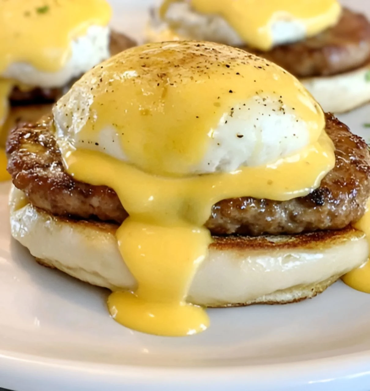 - Assemble the Benedict: Place toasted English muffin halves on plates. Top with sausage patties, then spinach.